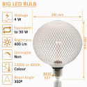 Esta lâmpada decorativa de grandes dimensões tem um filamento interno em PMMA e é também amiga do ambiente graças à sua eficiência energética com um casquilho E27. Ideal para iluminação decorativa, realçando espaços interiores e dando um aspeto original à noite.