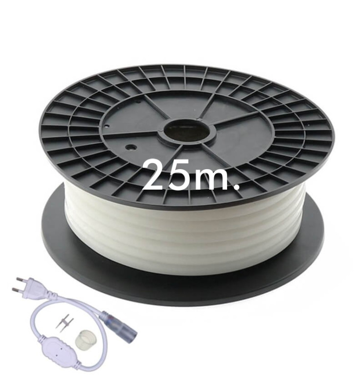 A bobina LED Neon CIRCULAR 360º é fornecida em 25 metros, incluindo também o cabo retificador, o pino de conexão e o plugue final. Cor Branco (3000k-4000k-6000k).