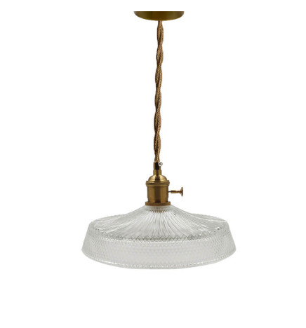 O candeeiro suspenso de cristal para lâmpada E27 é uma escolha elegante e versátil para qualquer espaço interior. O seu design simples e minimalista adapta-se a qualquer estilo de decoração, do clássico ao moderno. Os seus acessórios, como o casquilho e a guarnição, são de cor bronze.