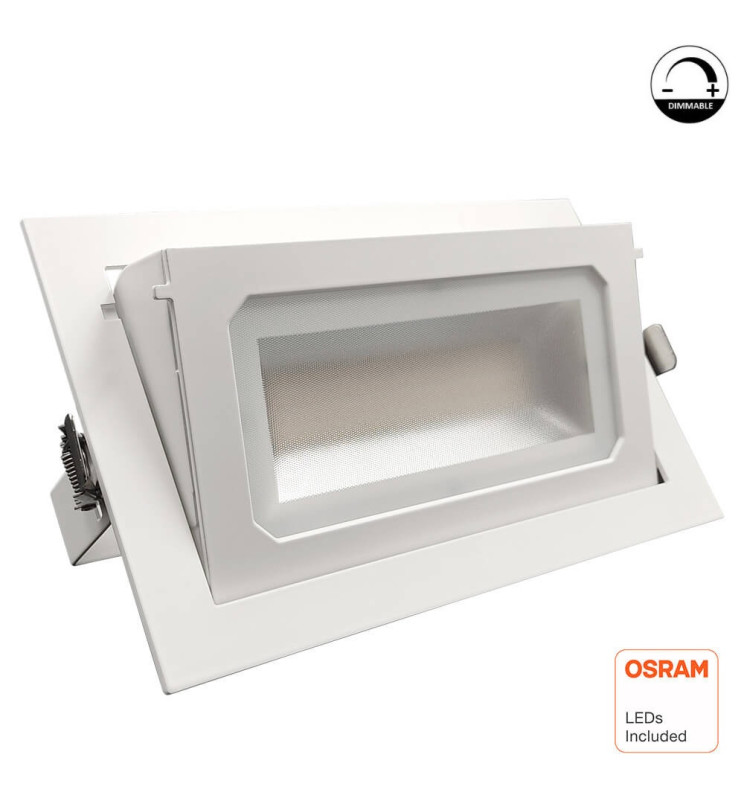 Rektangulär 40W LED-downlight med dimbar LIFUD-drivrutin (TRIAC, 0–10V eller DALI/PUSH). 3000K eller 6000K, utrustad med OSRAM Duris SMD2835-chip med 140 Lm/W, perfekt för professionell belysning. Tack vare sin vertikalt justerbara design är den idealisk för butiker och kommersiella utrymmen där ljuset behöver riktas mot produkter eller specifika områden. Med dimbar funktion kan ljusstyrkan enkelt anpassas efter stämning eller behov. Spara energi från första användningen med effektiv LED-teknik.