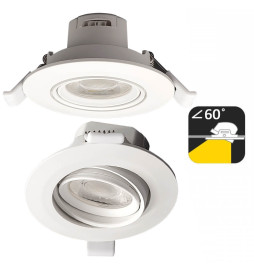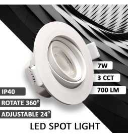 Vit infälld cirkulär LED-spotlight med 7W effekt. Med en öppningsvinkel på 60º, så att belysningen blir mer direkt för att fokusera ljuset på specifika punkter. Den utmärker sig genom att den kan vridas 360º och roteras 24º, vilket ger belysning till alla intressanta utrymmen.