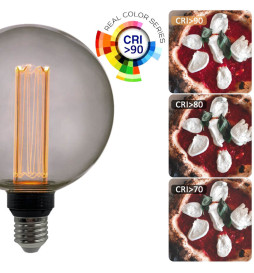 Denna G125-lampa i rökt glas med 4W effekt och PMMA-gravering på insidan, med E27-sockel, bidrar till att skydda planeten tack vare sin energibesparing. Glödlampan har en modern och elegant design med ett svart metallhölje som passar perfekt till alla inredningar.