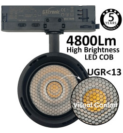 LED-Spårstrålkastare för professionell och kommersiell användning, MULTI-VINKEL från 24º till 60º. Högkvalitativ trefasdrivrutin från GxTronic. Högintensiv COB-ljuskälla, linsen är justerbar och ger en total ljusstyrka på lumens koncentrerat i en stråle med olika grader från 24º till 60º.