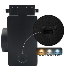 Enfas LED-Strålkastare med 40W effekt, denna GRAZ-modell i svart färg kännetecknas av att vara: Kraftfull, 3CCT valbar ljusstyrka, CRI92 och tillverkad med Bridgelux Chip. Professionell och mångsidig belysning för kommersiella utrymmen och bostäder. Den är perfekt som intonationsljus i alla strömskenesystem, vilket gör den perfekt för att framhäva specifika element, och den har också en primär öppningsvinkel på 100º.