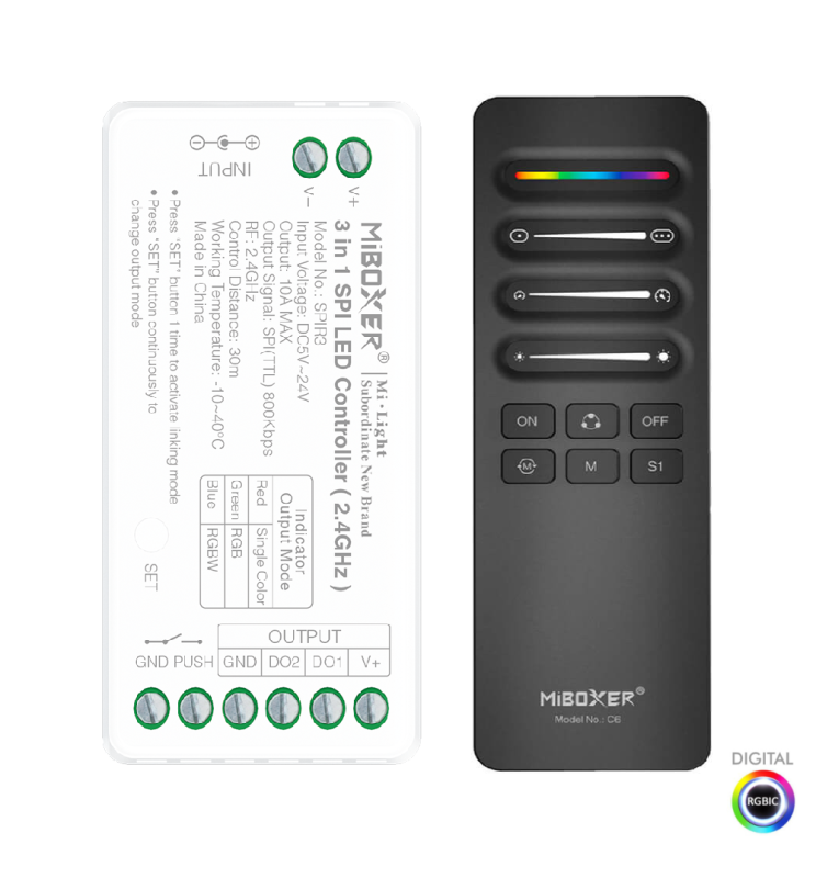 Paket Digital SPI-kontroller 2,4GHz (5-24V) + fjärrkontroll 2,4GHz, idealisk för digitala LED-remsor (RGB, RGBW eller monokromatiska). Kontrollerar varje LED individuellt, justerar hastighet, ljusstyrka, riktning, längd och dynamiska lägen. Möjliggör att spara upp till 4 anpassade scener. Njut av smarta animationer och anpassa färger och pixlar för detaljerade effekter.