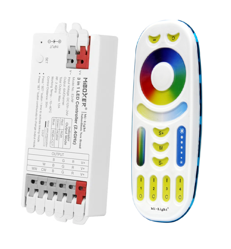 - Variabla utgångslägen: Växla mellan RGB, RGBW och RGB+CCT med en knapp.