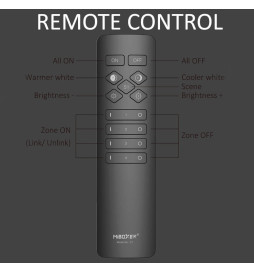 - RF Fjernkontroll: Gjennom RF-fjernkontrollen kan du slå lysene av og på med ON/OFF-knappen, justere lysstyrken og kontrollere fargetemperaturen i opptil fire forskjellige soner. Dette gjør det lettere å lage tilpassede miljøer og optimalisere belysningen i henhold til aktuelle preferanser.